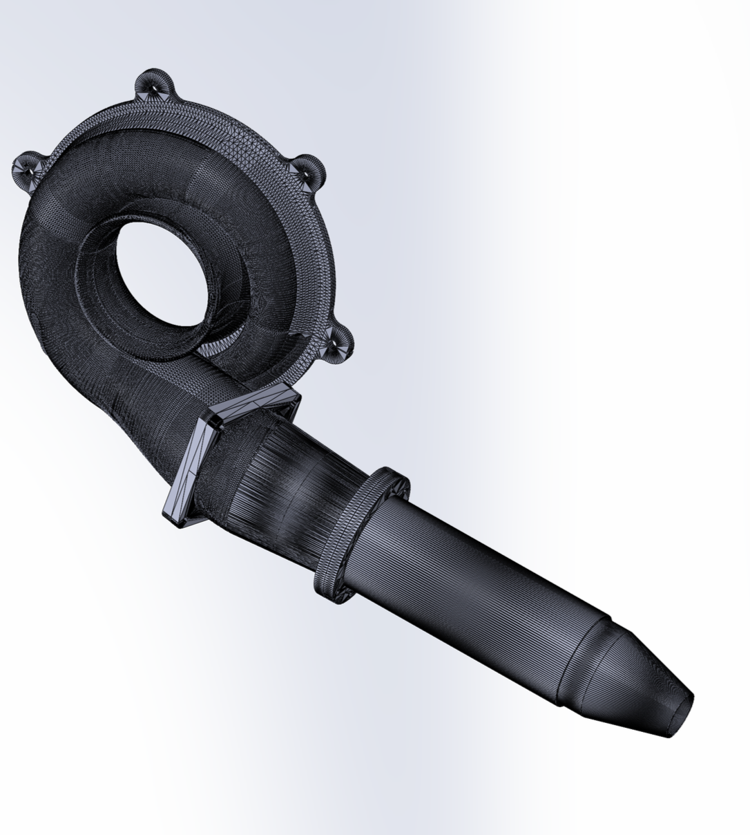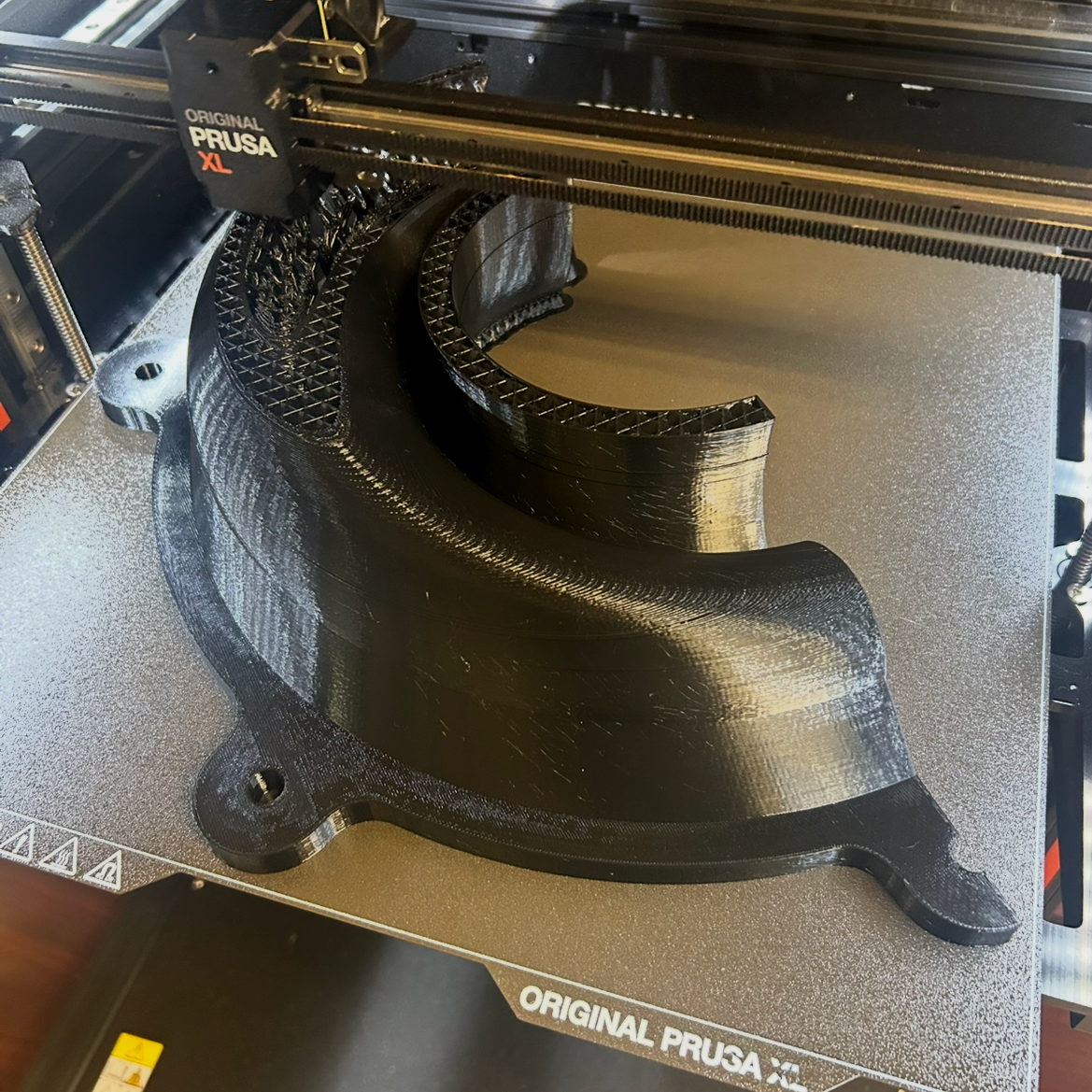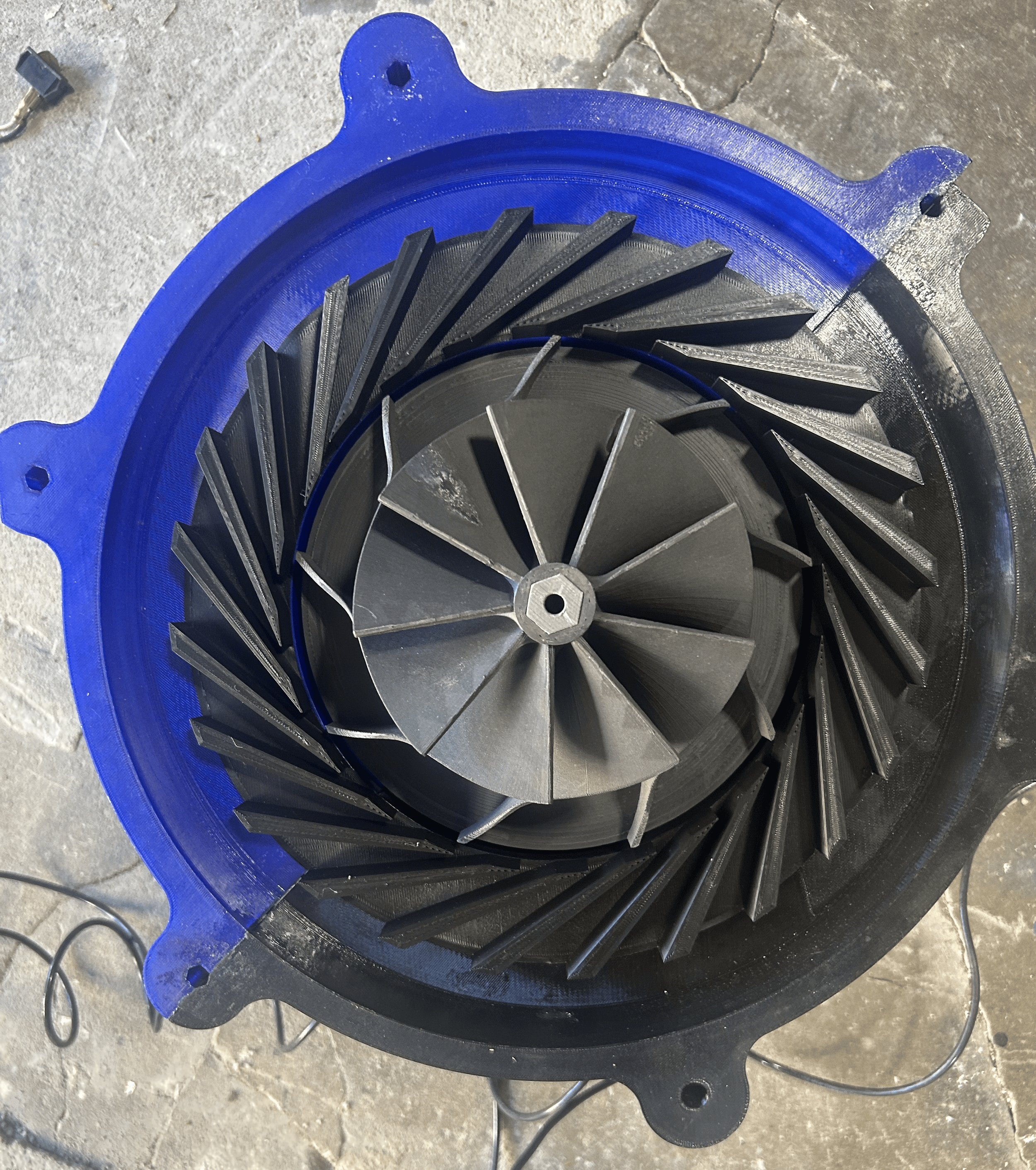 A high-speed electric motor drives a PLA carbon-fiber reinforced impeller inside a custom 3D-printed housing, generating strong airflow for combustion.