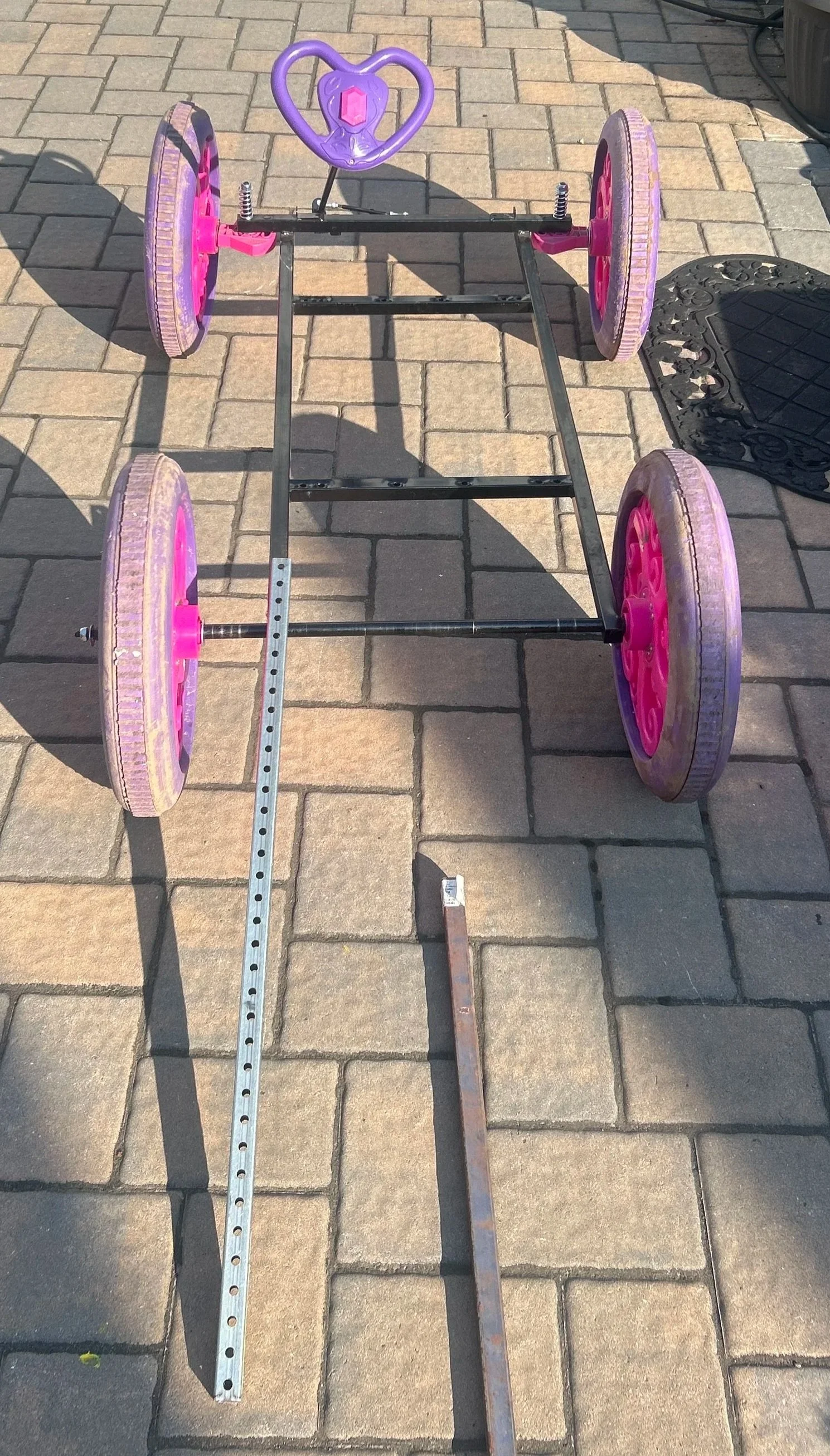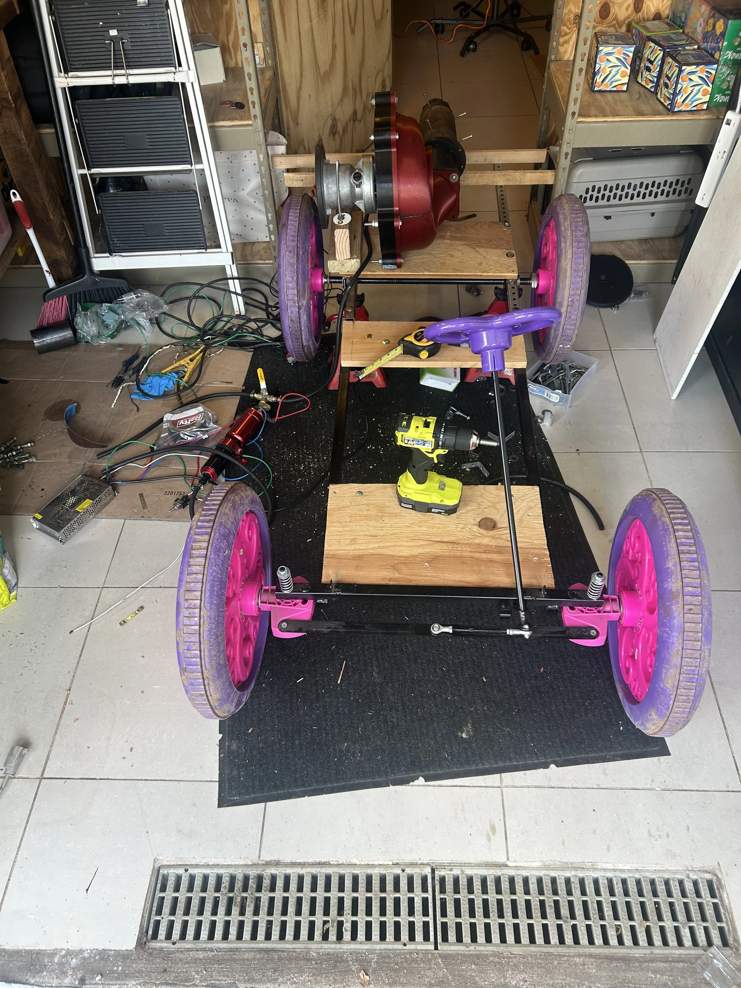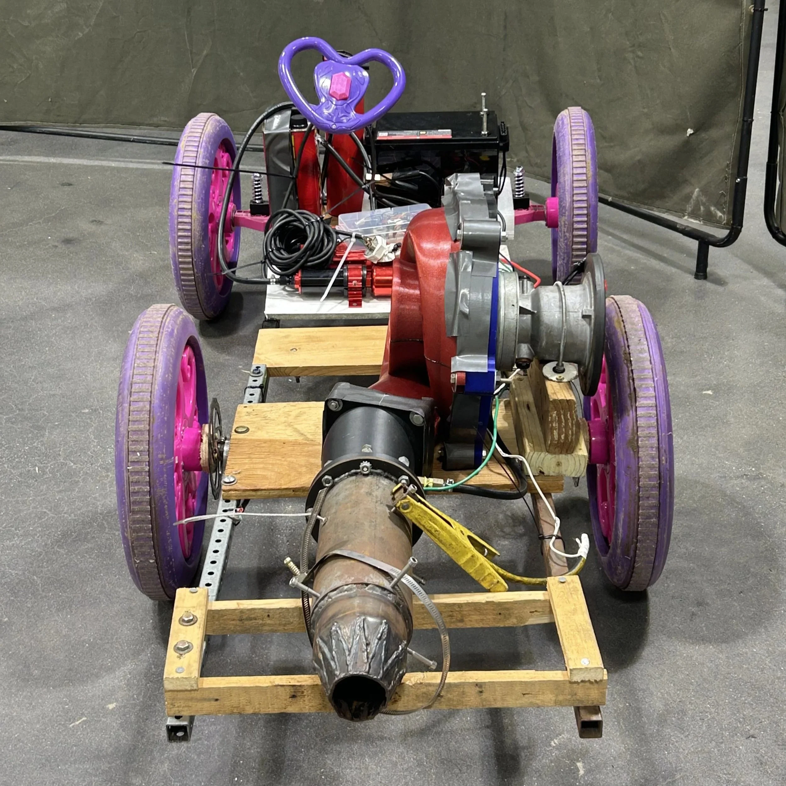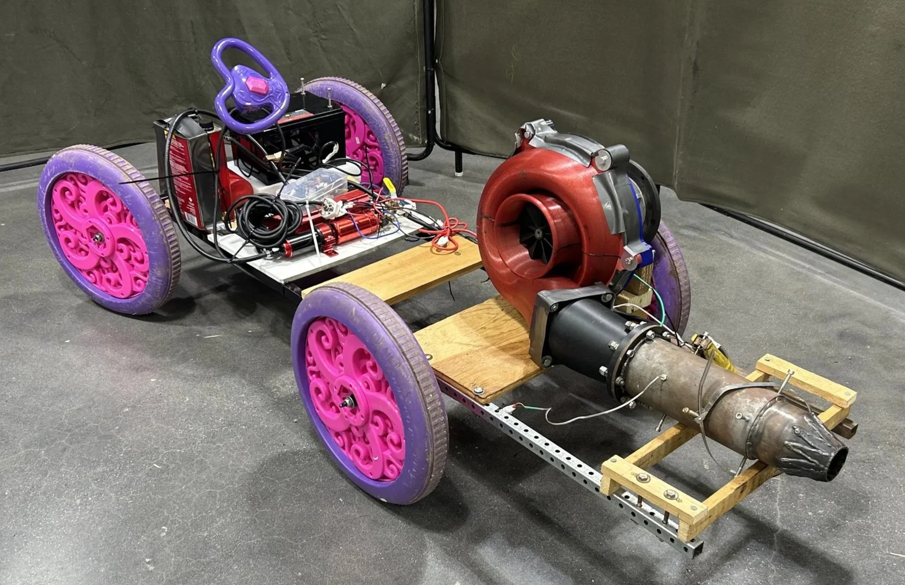 The Jet Engine Go-Kart was engineered from a stripped princess carriage frame and rebuilt with fully custom mounts and reinforcements. It runs on a 12V 100ah battery connected to a 2000W pure sine wave inverter that powers the diesel glow plug and onboard fuel system. The kart features active steering and is rideable, with a theoretical top speed of 50 mph, though it has yet to reach that due to the braking system still being developed.